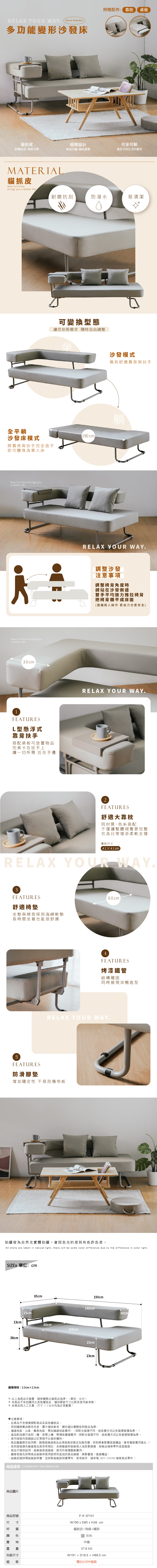 ✓ 可變換型態:沙發模式 (備有舒適靠背與扶手) 及全平躺沙發床模式 (將靠背與扶手完全放平即可變身為單人床,長度190 cm),可依照需求隨時自由調整